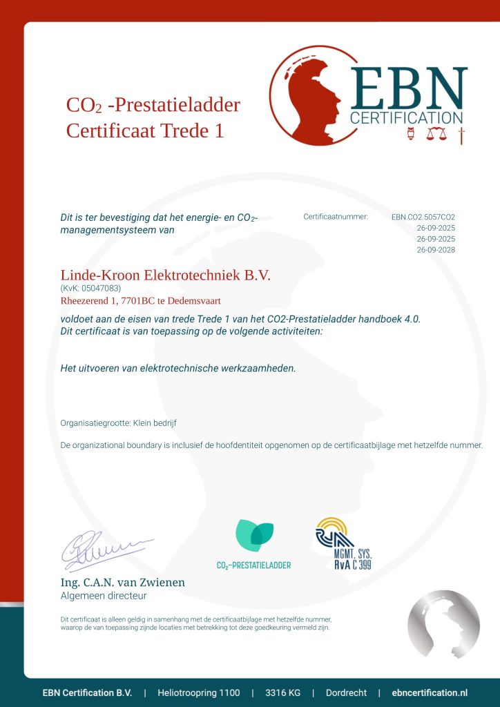 Bij Linde Kroon zetten wij ons actief in voor een duurzame toekomst. Onlangs zijn wij gecertificeerd op trede 1 van de CO₂-prestatieladder, conform de nieuwe norm 4.0. Daarmee hebben wij een belangrijke eerste stap gezet in het structureel in kaart brengen en verminderen van onze CO₂-uitstoot.